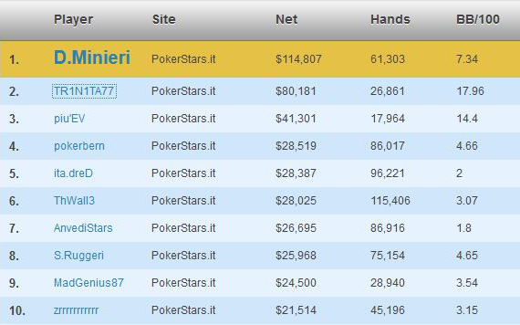 Al primo posto assoluto spicca uno stupefacente Dario Minieri! Il membro del Team Pro PokerStars continua la striscia positiva dell’anno scorso inanellando altri 90.000 € circa e confermandosi il migliore del circuito. Dietro di lui troviamo un’ottima sorpresa: “TR1N1TA77“, Top Grinder della specialità Pot Limit Omaha, in sole 26.800 mani è riuscito a mettere un ottimo profitto grazie alla irreale media di 18 bb/100… i prossimi mesi potranno dirci se si tratta di estrema edge sul field o semplicemente di god run: analizzando nel dettaglio il profitto di questo giocatore, si vede che prima del 2012 era in leggera perdita, e che dall’inizio dell’anno ha decisamente cambiato marcia!
