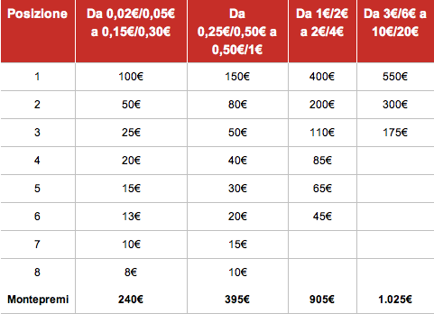 Ecco i premi per le 4 classifiche cash: