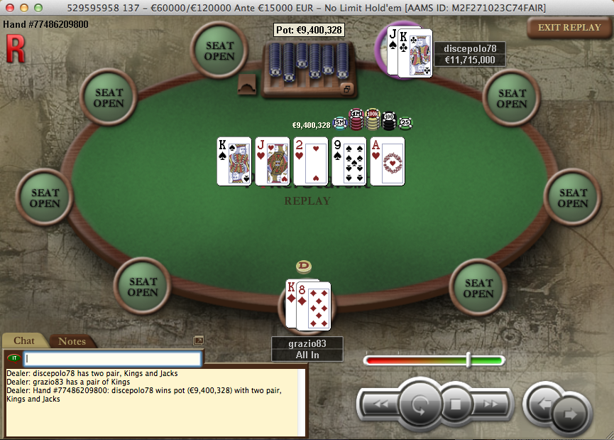 La particolarità di questo tavolo finale è stata nella discussione del deal: “discepolo78” da super chip leader (quasi il 90% delle chip in gioco) voleva portare a casa il massimo possibile ed è addirittura arrivato a rifiutare, 3 left, un accordo che gli avrebbe assegnato 45.000 € circa! Purtroppo questo impeto di avarizia gli è costato caro, perché rimasti in heads up il suo avversario è riuscito a raddoppiare sorpassandolo… così Di Iesu si è dovuto accontentare di un deal molto meno vantaggioso di quello che precedentemente aveva rifiutato, “accontentandosi” di 32.000€!