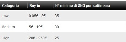 Guadagnare i punti per accedere alla speciale classifica è semplicissimo: ti basterà partecipare ai sit&go di Titanbet.it, composti da almeno 5 giocatori e giocarne un minimo a settimana secondo la seguente tabella che tiene in considerazione anche il buy-in. Per ogni sit&go giocato in più rispetto al minimo richiesto, si otterranno 1,5 punti in extra.
