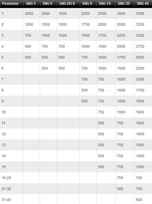 Potrai consultare la tabella sottostante per sapere quanti punti verranno assegnati a seconda del piazzamento ai tavoli. Se viene raggiunto il minimo di Sit&Go per settimana, i punti finali saranno calcolati come la Somma della media punti per Sit&Go (con la formula “Punti Totali”/”Sit&Go Giocati”) e i Bonus ottenuti in base al numero totale di Sit&Go giocati saranno sommati alla media.