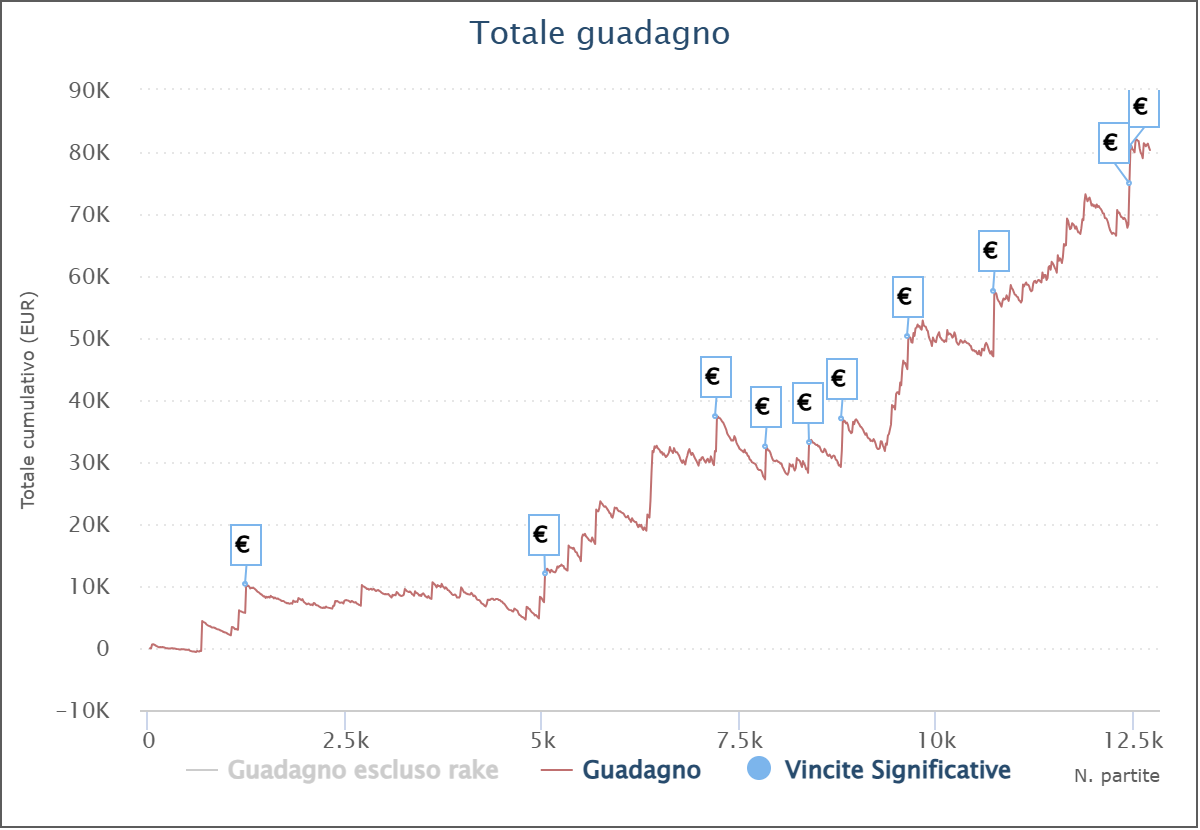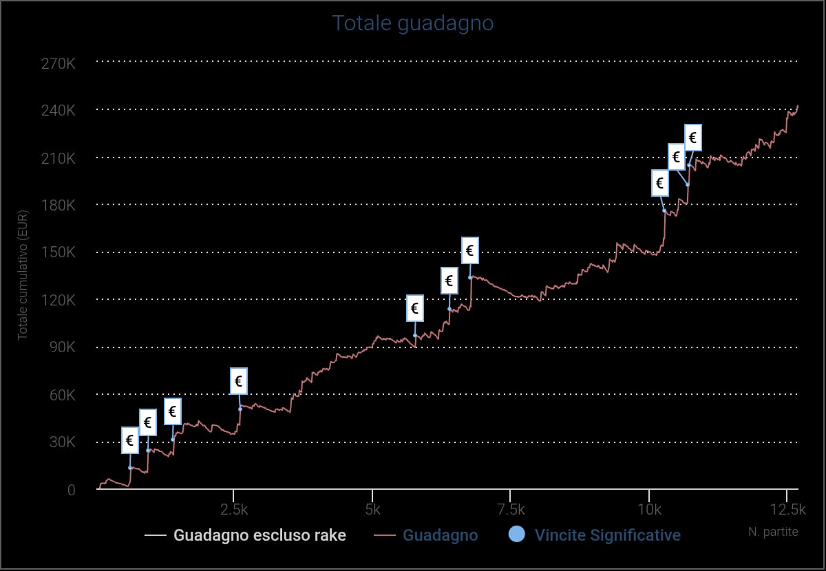Troviamo poi il sardo Gianluigi ‘AA-GIANLU-AA’ Giuliani, titolare di 12.690 tornei a buy-in medio 40€ per un profitto di 241.150€.