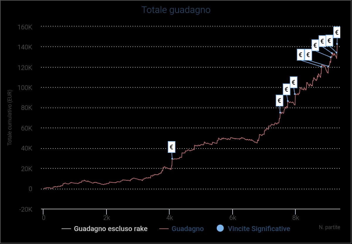 Il livornese Mikel ‘VVsMolly’ Calò ha invece all’attivo 9.322 tornei a buy-in medio 23€ per un guadagno di 142.693€.
