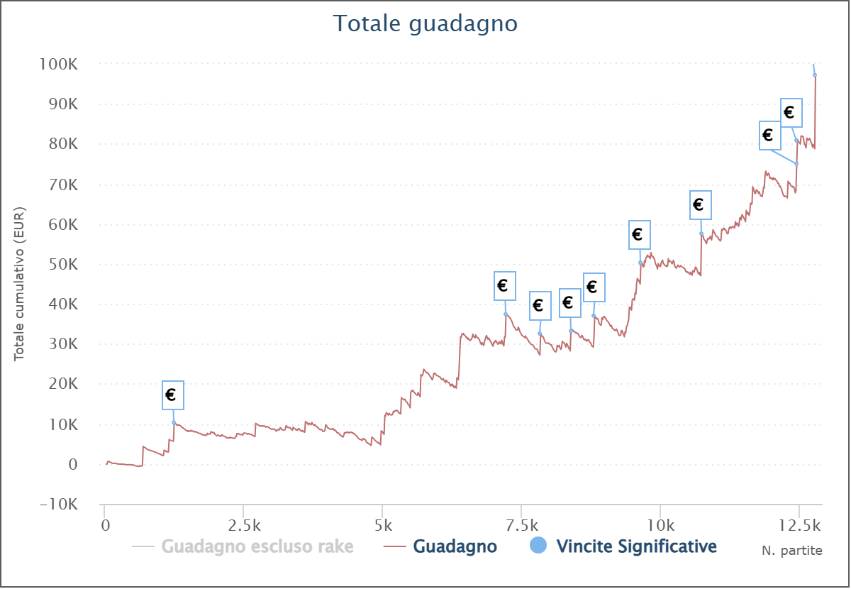 Dal primo torneo giocato ad agosto 2021, oggi Antonio su PokerStars vanta uno storico di 12.793 mtt a buy-in medio 20,58€ per un profitto che dopo questo shot è di 97.000€!