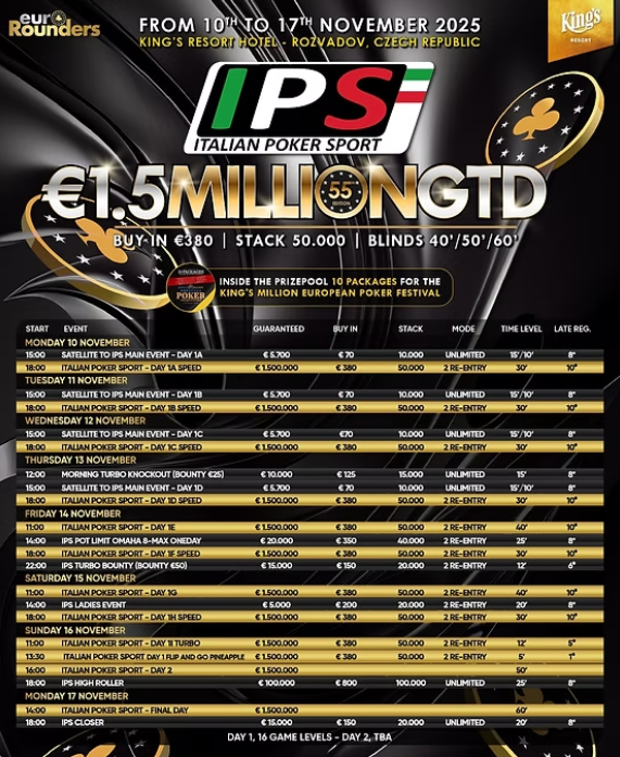 Nel programma completo anche satelliti, l'OMAHA, un evento LADIES, un HIGH ROLLER e molto altro. Ulteriori info sul sito del casinò e su euroRounders.
