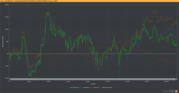 Superato l’impatto con i colori, alcuni grinder non si trovano a proprio agio con un altro aspetto: le linee visualizzate nel grafico, tutte e quattro (profit, EV, showdown e non showdown), sembrano diverse da quelle della versione precedente, meno spigolose. Evidentemente gli sviluppatori di HEM2 hanno pensato di “ammorbidire” l’impatto visivo del grafico, rendendo più fluide e morbide le linee: molti giocatori però sembrano affezionati all’andamento irregolare della propria linea verde, ed il nuovo look risulta sgradito a molti.