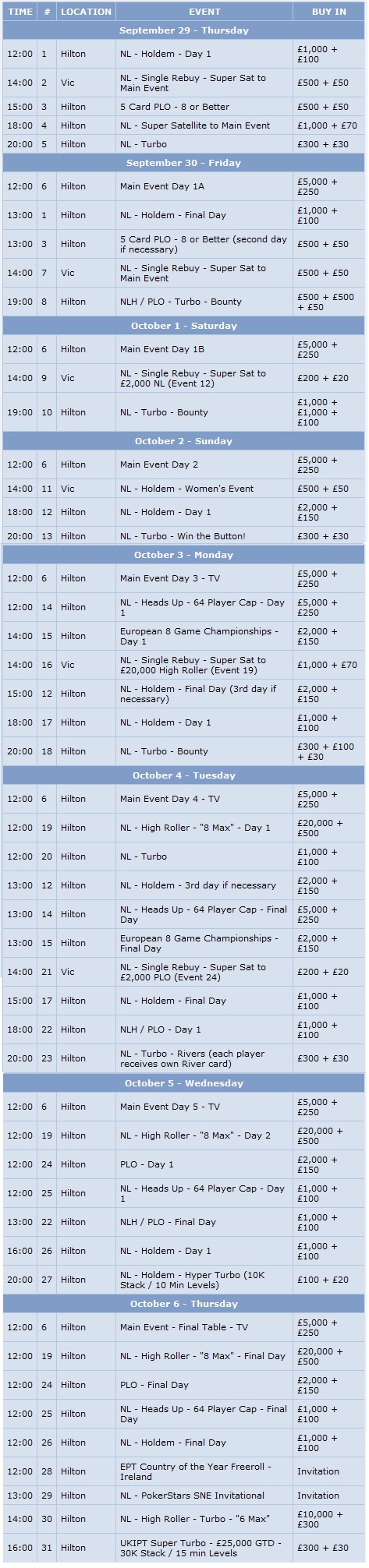 Il Main Event EPT London avrà anche la funzione di evento conclusivo del prestigioso PokerStars.com UK & Ireland Poker Tour, il circuito della picca rossa nel Regno Unito. Nella stagione precedente il torneo ha richiamato un field molto corposo, ben 848 giocatori per una prima moneta da 900.000 £ finita nelle tasche di David Vamplew, lo scozzese clone di Harry Potter che ha dato spettacolo anche al WPT di Venezia recentemente vinto dal nostro Alessio Isaia.