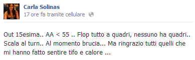 Ecco il suo post comparso su Facebook, pochi minuti dopo l’eliminazione: