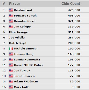 Chipleader è Kristan Lord con 475.000 chips, seguito a ruota da Stewart Yanick a 468.000, mentre Brandon Guss al terzo posto è staccato di quasi 100.000 gettoni (371.000).