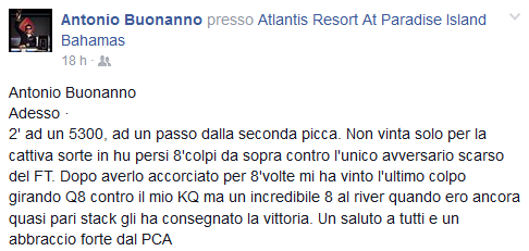 Il nostro è stato superato nel testa a testa conclusivo da Alexander Denisov (117,250$) che, stando a quanto riportato da Buonanno su Facebook, ha ribaltato una situazione complicatissima.