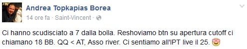 Qualche rimpianto anche per la voce delle dirette streaming PokerStars Andrea ‘Topkapias’ Borea (in foto con il collega Antonio Graziano) eliminato fuori dalla zona dei premi dal call largo di un avversario.